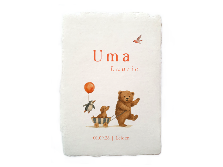 Geboortekaartje met illustratie van beer, hond en pinguin.