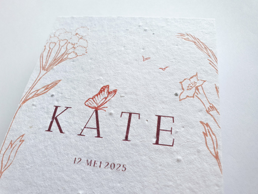 Groeipapier vertegenwoordigt een vooruitstrevende en milieuvriendelijke benadering om planten te laten floreren. Het bestaat volledig uit natuurlijke grondstoffen, zoals gerecycled papier, bloemzaden en organische vezels. Het papier is volledig afbreekbaar en kan gecomposteerd worden, waardoor het een ecologisch verantwoorde keuze is om planten te kweken. Op deze manier kun je jouw geboortekaartje of trouwkaart transformeren tot prachtige bloeiende planten!