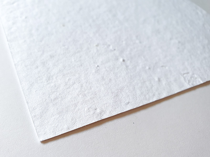 Door de losse vezels en het ongelijke oppervlak kan de bedrukking per kaartje variëren in positie en dekking – soms zelfs iets schuin of minder egaal. Dit is onderdeel van de charme van dit bijzondere papier.