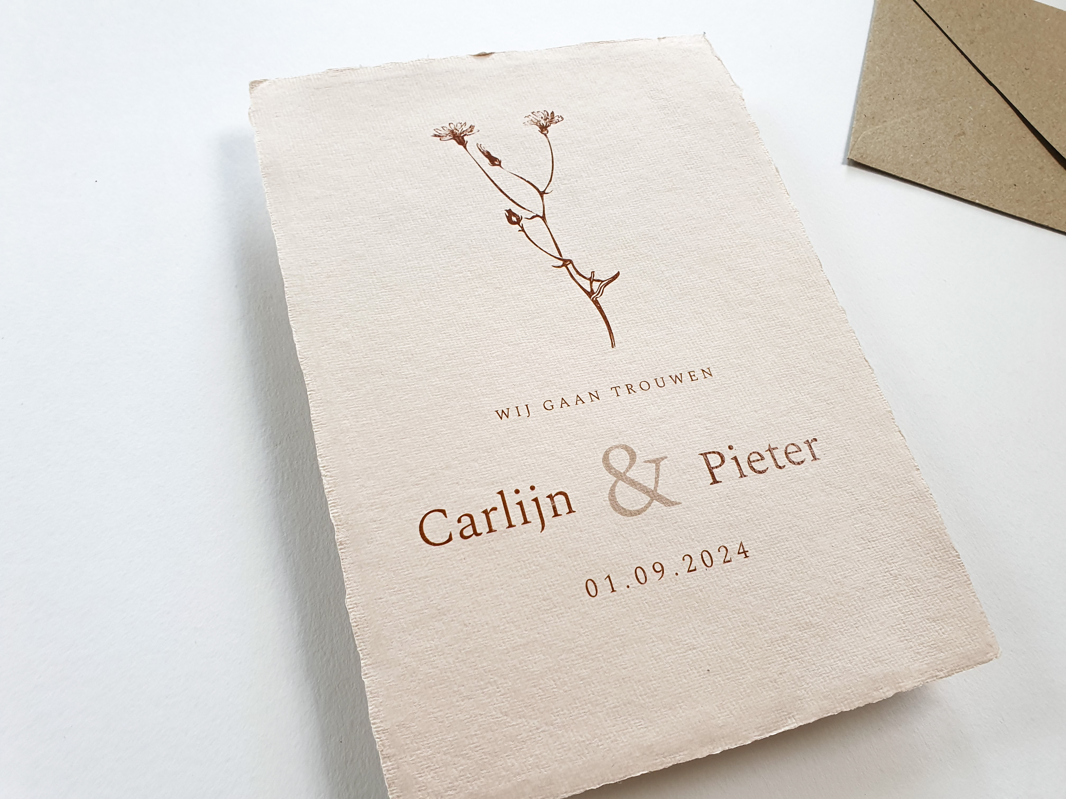 Het ontwerpen van een trouwkaart of complete trouwhuisstijl is iets bijzonders – en dat begrijpen wij maar al te goed. Daarom bieden we gratis en vrijblijvend advies en denken we graag met je mee, zodat jouw trouwkaart perfect wordt en helemaal bij jullie stijl past.